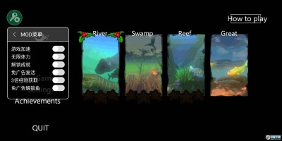 辅助菜单:游戏加速、无限体力、解锁成就、免广告复活、3倍经验获取、免广告解锁鱼