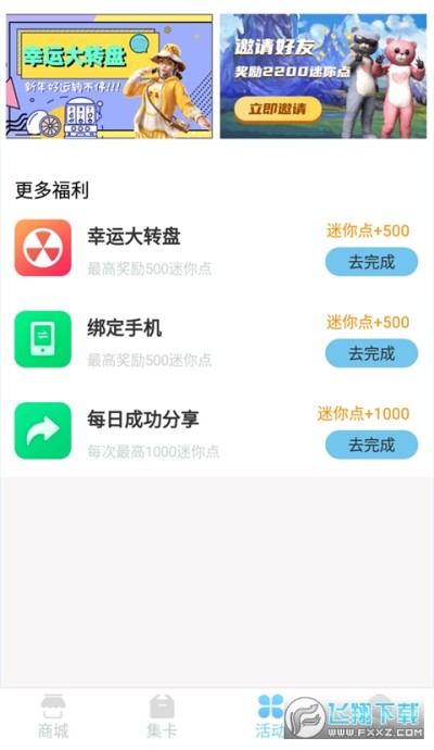 1、首先进入迷你之家软件最新版中,可以看到有商城、集卡、活动、我的四个板块;
