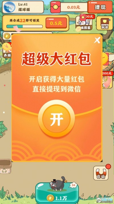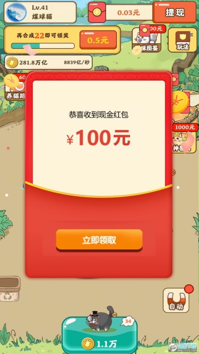 这个游戏每合成升一级都有奖励,另外合成一定的次数也有红包奖励。开始游戏前先打开自动合成功能,这样省力很多。红包按百分之一比例全部提现。我的小农场是一个合成升级的小游戏,新人送了25,我们去合几级凑个0.3提现。
