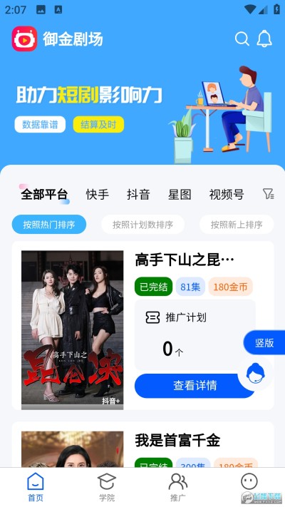 御金剧场短剧app安卓版是一款短剧授权推广平台,软件中用户可以选择不同类型剧集的短剧在其他平台上进行推广,成功推广短剧即可赚取收益,还可以助力短剧文化发展,对软件感兴趣的话不妨点击下载试试!