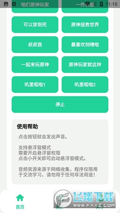 需要注意的是,在使用该APP之前,用户需要开启悬浮窗权限,点击小开关即可启动悬浮窗模式。此外,该程序的音频资源来源于网络收集,仅限用于交流学习,不得用于任何非法用途。