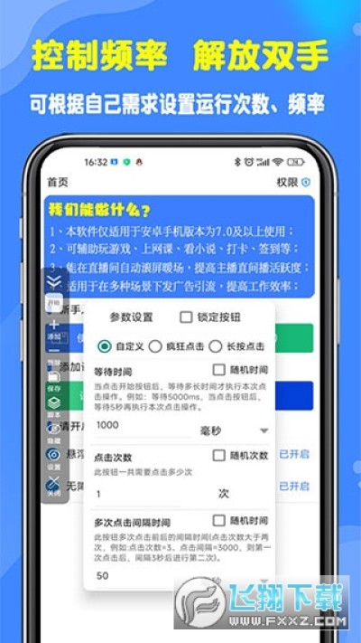 连点加速,自动执行;随时在任何位置记录点击或滑动操作,解放用户双手,实现连续点击加速,轻松设置点击频率、时间间隔
