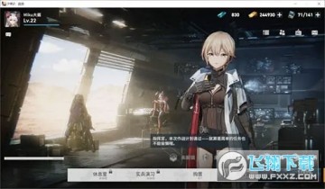 右下方机库为局内支援技能。下方休息室(宿舍)和实兵演习(PVP)尚未开放,购置为抽卡界面,整备室为角色养成界面,进入整备室。