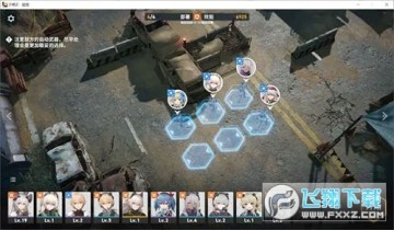 部署界面,六边形格子为我方的可部署格子,上方显示我方可部署的人形和当前效能(战力)我们可以通过拖动人形来调整阵容和布局,人形头顶的颜色标记代表当前人形的伤害类型。
