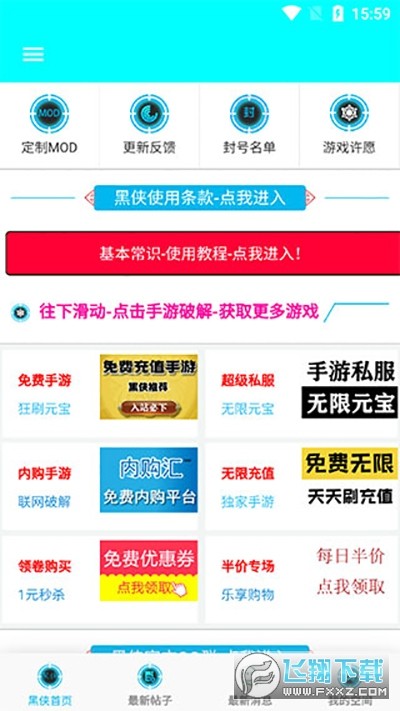 1、在飞翔下载安装黑侠apk之后,打开软件,可以看到有着很多板块;