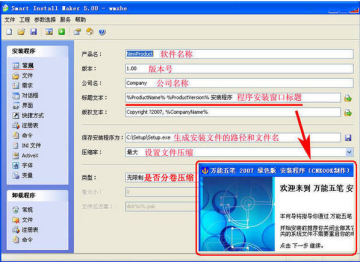 Smart Install Maker 5.04是一款创建打包安装程序的软件。是一款适合电脑初学者使用的安装程序制作工具。本软件使用简单,上手方便,功能齐全,不需要编写一行代码或脚本,就可制作出非常专业的安装程序,特别适合于从没使用过安装程序制作工具的新手使用。对于熟悉安装程序的人,此软件也可以加快安装程序制作的速度。而且用本工具制作的安装程序的文件头非常小,非常适合于对小型程序的封装。
