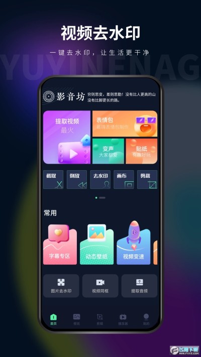 影音坊一键去水印app是一款手机视频编辑应用软件,在软件中可以轻松使用相关的功能剪辑出一个精彩的视频,只需要手机就能搞定,使用完全免费。该软件中汇集了日常中喜欢使用的一些音频或者视频处理功能,可以将图片合成视频,或者是将视频制作成GIF动图。