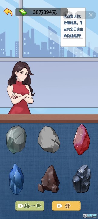 在主页点击【宝石】进入开石界面,将获得大量奖励!(不同物品,老板娘的表情与台词都有变化噢)