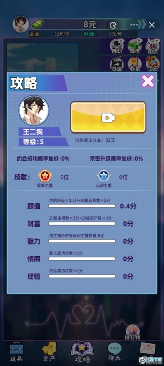 约会可以升级跟主播的关系,主角个人魅力可增加成功率。跟主播的亲密度关系进阶:关注主播、心动主播、暧昧主播、热聊主播、亲密主播、专属主播。亲密度进阶将提升主角个人魅力分数,进阶魅力排行榜