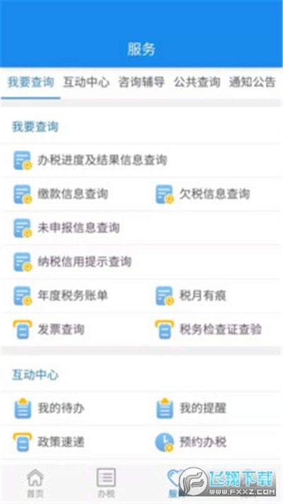 【公众服务】查看办税日历、办税地址、办税指南、公告信息、税务法规等信息。