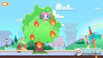 5、不好,原来是着火了,还有只小猫被困在了树上。小伙伴,快给消防员糖糖搭把手,拖动右边的水管,对准火团。耶!大火熄灭了!