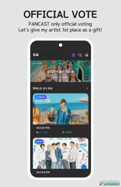 fancast官方版投票软件是一款针对韩国演出、歌曲、偶像团体打造的粉丝投票软件,在平台上大家可以给自己喜欢的爱豆们进行投票,为你喜欢的男孩女孩们打call,清晰的投票结果,自由查看,关于你喜欢的爱豆的热门资讯都会第一时间推送给你,还有最新明星物料。