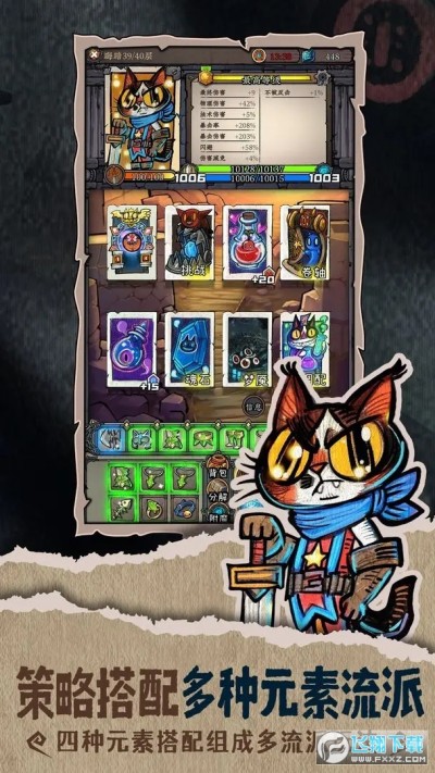 游戏中将随机获得装备和法术等道具,闯关解锁选择不同的神器,冒险途中还有各种随机事件发生,玩家需要利用自己的策略和技能来强化自己,打败猫猫怪物。