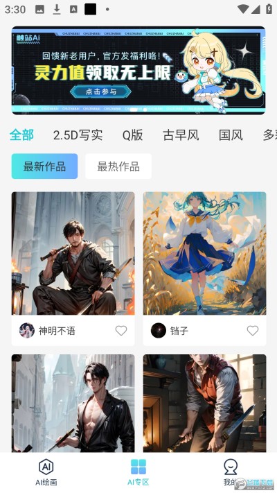 触站ai绘画是一款插画师聚集地的绘画创作软件,用户能在里面看到不同画师绘画的漫画,你喜欢的画师都在这里。拥有海量美图,并且图片可以无水印一键下载,软件上面每天都会分享优秀的绘画作品,自由筛选,有各种风格的作品。