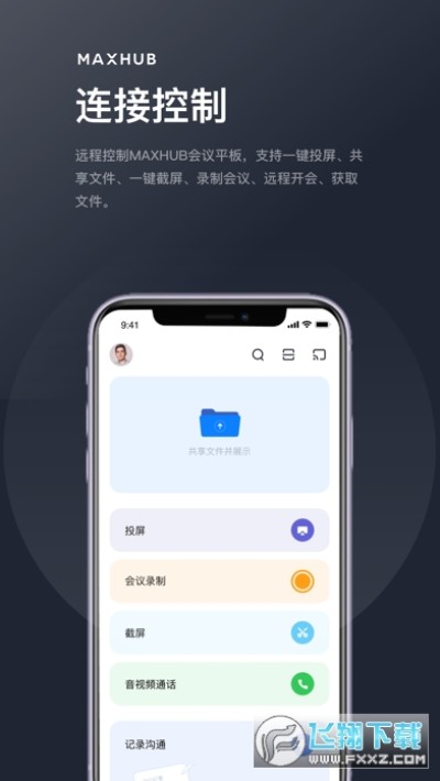 1、远程控制MAXHUB会议平板,支持一键投屏、共享文件、一键截屏、录制会议、远程开会、获取文件