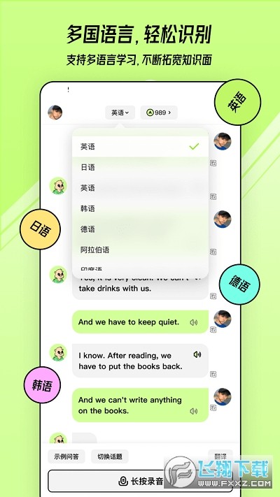 TalkAI练口语支持英语、中文、日语、德语等多国语言,采用纯正的发音音色,支持不同语速调节,让你与智能AI进行自然且流畅的对话。