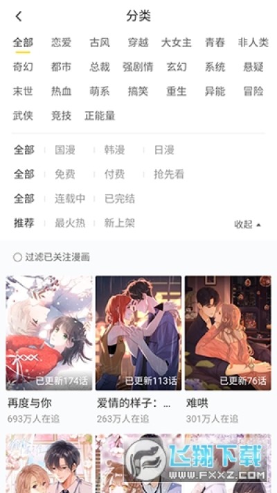 1、漫画的分类很全面,热血的,搞笑的,青春的,恋爱的,穿越的,古代的,悬疑的等等。