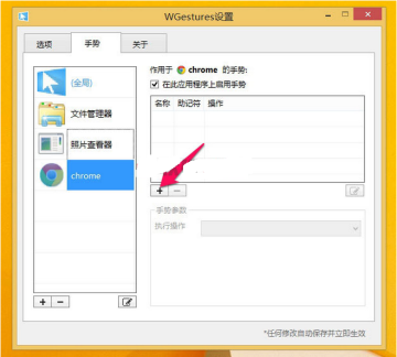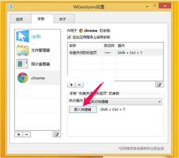 WGestures的动作触发也是通过程序原有的快捷键来实现的,恢复刚刚关闭的标签页以Chrome中的快捷键为Ctrl+Shift+T,所以我们通过点击下图中箭头所指向的“录入快捷键”后,再通过键盘直接按下Ctrl+Shift+T即可成功录入!