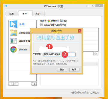 在下图中1处,画出鼠标手势,我画的是右左;在2处为鼠标手势添加名称后点击保存。