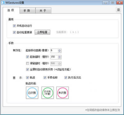 虽然chrome有多种鼠标手势扩展,但至今没有一个完美实现其全局鼠标手势的,什么叫全局呢?比如在chrome的设置页面,或者某个扩展程序页面,鼠标手势依然可以使用这就叫Chrome全局鼠标手势,目前WGestures 就可以让Chrome实现!跟软件小品一起来设置吧,先打开WGestures 的设置页面并切换到“手势”选项卡: