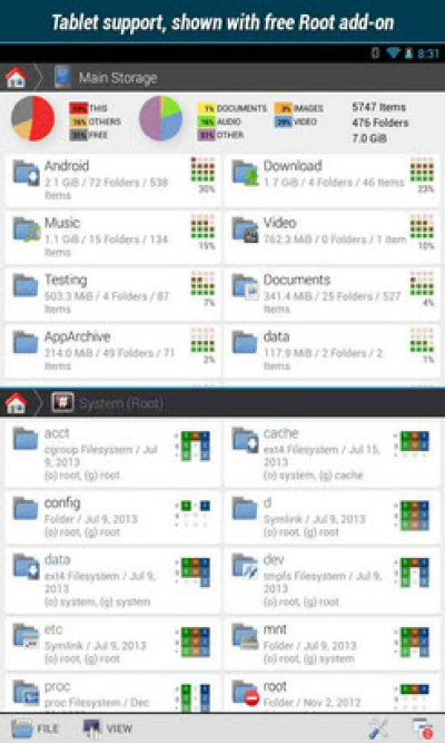 - 高效的布局:主界面提供了已添加书签位置的列表、已挂载的存储空间和系统分卷,而不是仅仅显示/mnt/sdcard目录