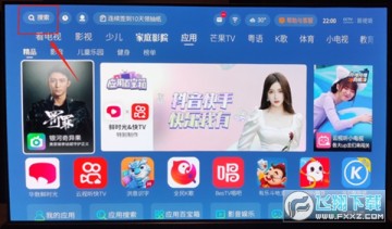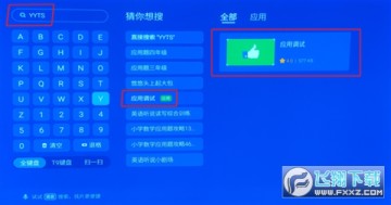 2、打开电视机,按遥控器的“主页”键,进入主页。用遥控往上移选择并点击左上角的“搜索”,输入“YYTS”,选择点击“应用调试”,选择下载并安装运行。