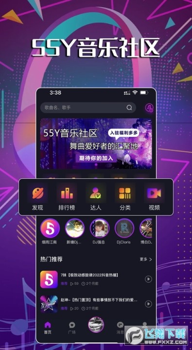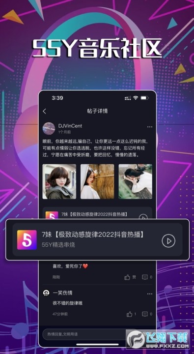 55y音乐社区:dj音乐人聚集地,在这里有好玩好听的音乐,让你大饱耳福;在这里有音乐大咖/音乐爱好者,让你轻松结识拥有相同兴趣的朋友。