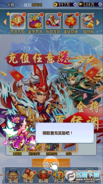 3、完成任意的冒险闯关,领取稀有的武将和装备。