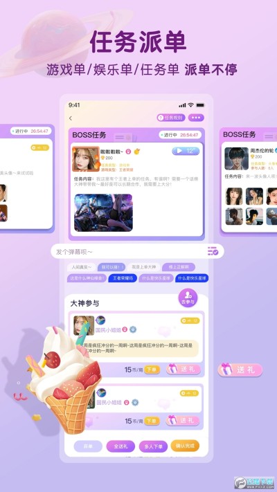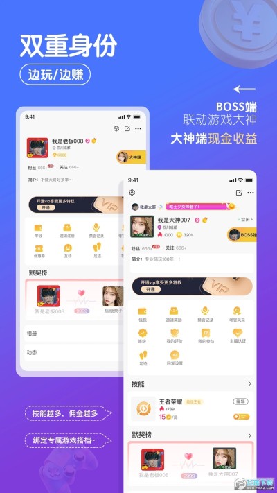 用户可注册成为下单的BOSS或接单的大神,两种身份,随意切换,更强的识别性 让用户边玩边赚钱。