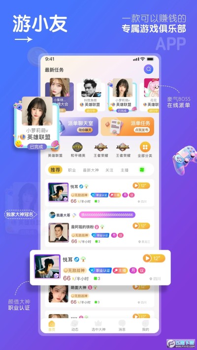 游小友 App是一款专注于游戏找搭子的平台,汇集了王者荣耀、和平精英、永劫无间、金铲铲之战..等众多游戏。由老板实时发布任务,大神在线接单。