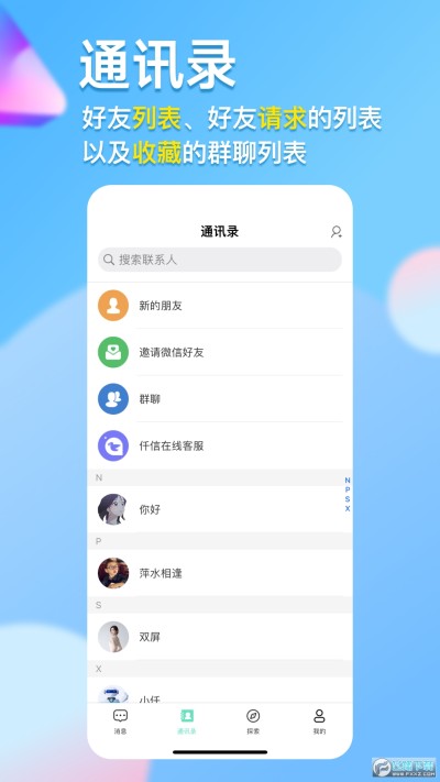 3、通讯录:该模块显示微商好友列表,好友请求的列表以及收藏的群聊列表。