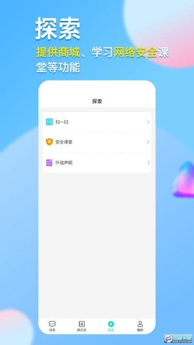 1、探索:该模块为微商用户提供公共聊天室进行嗨聊,与智能机器人进行趣聊,学习网络安全知识的安全课堂,后期还会开发微商店,微会议室,微大讲堂等功能。