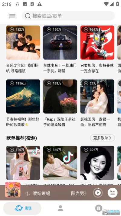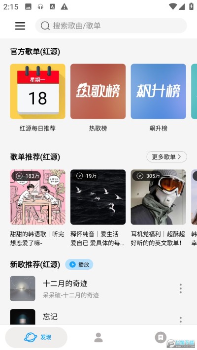 2)歌单推荐:红源推荐歌单登录红源账号后可根据账号听歌喜好推荐歌单,其他平台随机推荐 (可下拉发现页面刷新推荐)