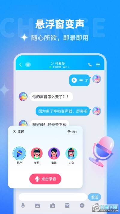 「实时聊天变声」支持悬浮窗变声,可以在其他APP内实时使用,即说即用,欢乐无间断~