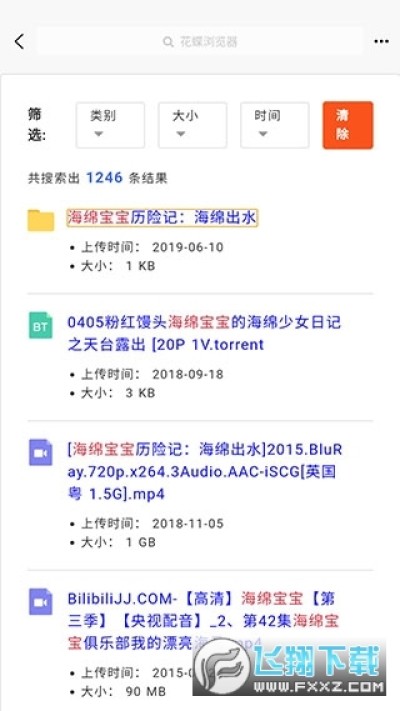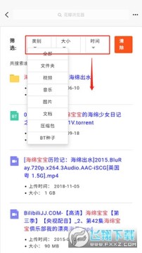 3、点击搜索之后这里有很多的资源,可以通过类别、大小、时间来进行筛选
