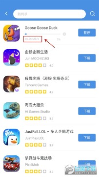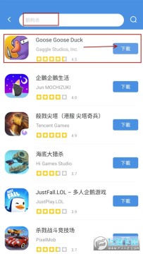 3、小编以最近大热的鹅鸭杀游戏为例,在上方搜索栏输入“鹅鸭杀”即可在下方查看该游戏的评分以及厂商信息,点击一键下载即可。