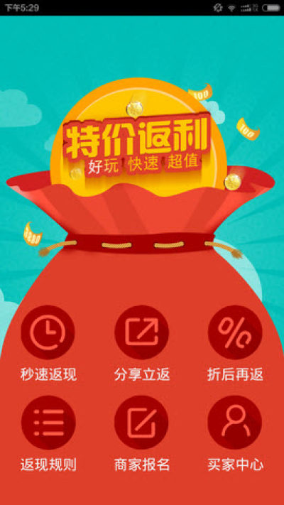 我要特价这款手机软件集折扣,返现,游戏为一体,为消费者提供全网最超爽的购物体验,首创全新的返利模式,直营式返现、由商家直接面对买家进行返现,是大家网购的最佳去处!