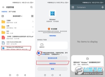 安装完成后,在手机桌面上找到winlator,运行一次,应用会要求权限,点允许。然后应用会自动退出,再运行它就会闪退,显示 Unable to install obb image。下一步解决这个。