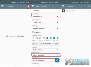 这一步是最重要的,点击winlator右上角的“+”号创建容器,在创建时注意调整分辨率,和下面这两个选项。