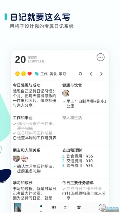 格志日记强大且灵活的格子形式,如同一个生活收纳盒,帮助你把日常的方方面面都归类整理。你不仅不会无从下笔,甚至还会爱上写满格子时的充实感和满足感。