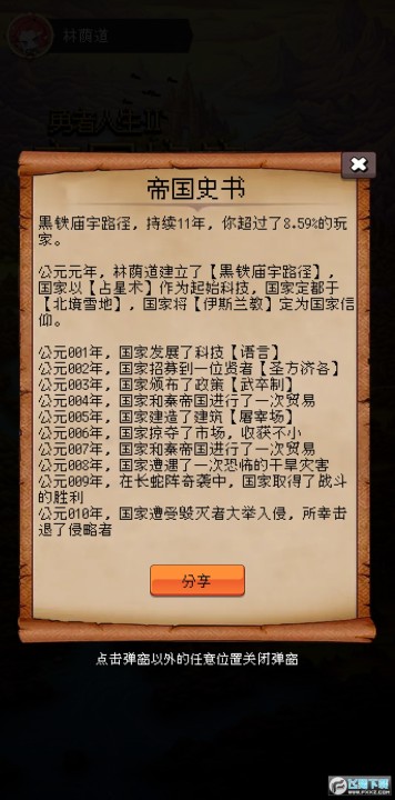 ÕâÊÇÒ»¸öRoguelikeÄ£Äâ¾ÓªÓÎÏ·£¬ÓÃÈâ¸ëµÄ¼«¼òÈýѡһ²Ù×÷´ò¿ªÎÄÃ÷ϵÁС£ÄãËù½¨Á¢µÄе۹ú´Ó¹«ÔªÔªÄ꿪ʼ£¬×÷Ϊ¹úÍõ£¬Ã¿Ò»ÄêÄã¶¼ÒªÌæ¹ú¼ÒÔÚÎÞÊýËæ»úʼþÖнøÐÐÈýѡһ¾ö²ß¡£¹ú¼ÒÊÂÎñ¶àÖÖ¶àÑù£¬°üÀ¨·¢Õ¹¿Æ¼¼¡¢°ä²¼Õþ²ß¡¢½¨Ô콨Öþ¡¢×ڽ̴«²¥¡¢Íâ½»ÊÂÎñ¡¢ÕÐļÏÍÕß¡¢ÌìÔÖΣ»ú¡¢Ì¸Åб©¶¯¡¢ÂÓ¶áºÍ¹¥³Ç¡¢µÖ¿¹ÈëÇֵȵȡ£ÓÎÏ·µÄÄ¿±êÊÇÈùú¼ÒÒÙÁ¢²»Ð࣬ÓÀÔ¶´æÐø£¬ÈÃÈ˿ڳÖÐøÔö³¤£¬´ÓС²¿Âäµ½ÖеÈÍõ¹ú£¬ÔÙµ½ÈÕ²»Âä´óµÛ¹ú¡£