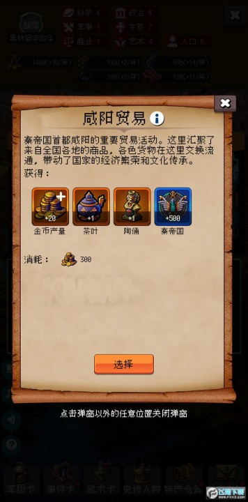 ¿ª¾ÖÈýѡһ¹ú¼ÒµÄµØÀíλÖã¨ÎÒ½¨ÒéÄãÑ¡Ôñ½ð±Ò²úÁ¿·á¸»µÄ»Æ½ðº£°¶£©£¬¹ú¼ÒµÄ³õʼ¿Æ¼¼£¨Õ¼ÐÇÊõ·¢Õ¹¾ùºâ£©£¬¹ú¼ÒÐÅÑö£¨µÀ½ÌµÄ×ڽ̿¨Ð§¹û×îÇ¿£©¡£µÚÒ»Ä꣬ѡÔñ·¢Õ¹¿Æ¼¼¡¾Ôì´¬Êõ¡¿£¬Ìá¸ßÉÌÒµÊôÐÔ¡£µÚ¶þÄêºÍÂÞÂíµÛ¹ú·¢ÉúÁËÒ»´Î¾üʳåÍ»£¬´ó»ñȫʤ¡£µÚÈýÄê°ä²¼Õþ²ß¡¾Îä×äÖÆ¡¿£¬ÐèÒªÒ»¶¨µÄÅäºÏ£¬ÄܼÓÇ¿²½±ø¹¥»÷¡£µÚ°ËÄêÔâÓöÁËÒ»´Î¿Ö²ÀµÄºéË®£¬ÈË¿ÚÑÏÖØËðʧ¡£µÚÊ®ÄêÔâÓöÇØµÛ¹ú´ó¾ÙÈëÇÖ£¬×îÖճɹ¦»÷Í˵оü¡£½ÓÏÂÀ´µÄÊ®Ä꣬ÓÖÊÇÒ»´Î·¢Õ¹-½ø»¯-Ä¥ÄÑ-ÖØÉú¡£Ã¿´æÐø¹ýÒ»¶ÎʱÆÚ£¬Äã¾Í»á·¢ÏÖһЩȫеÄʼþºÍÍæ·¨£¬ÀýÈç³É¹¦Âʲ©ÞĵÄ̸ÅÐʼþ¡¢Ìá¸ßÁ½¹úÓѺöȵÄÑÝϰʼþ¡¢Êܵ½ÌìÆøÓ°ÏìµÄ¹¥³ÇÕ½µÈ£¬¸üÓн¨ÔìÆæ¹Û£¨Çص۹úµÄ°¢·¿¹¬»òÊǹŰ£¼°µÄºú·ò½ð×ÖËþ£©ÒÔ¼°Õ÷·þ´óµÛ¹úµÄÖÕ¼«ÌåÑé¡£