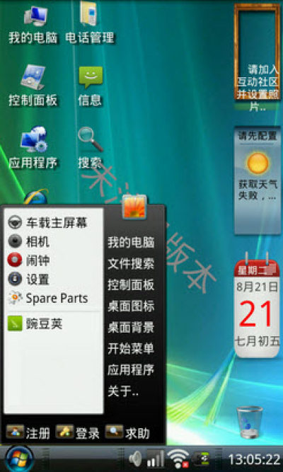 提供了天气预报、时钟、闹钟、登录、相框、添加系统插件等功能,您可以通过在桌面长按菜单中设置