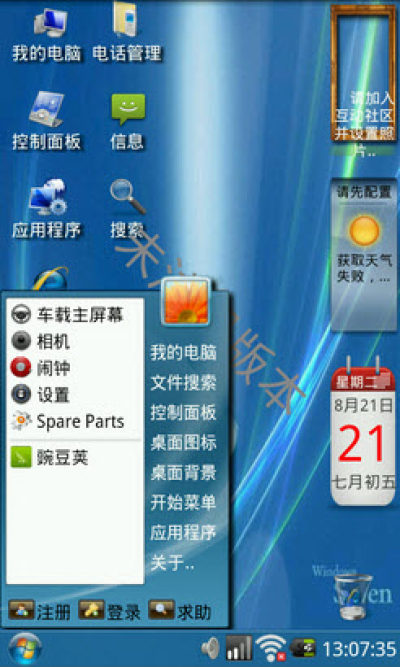 装酷神器是一款将安卓设备(智能手机、智能平板、智能电视)完美变身为Windows的神奇软件,可以切换为Windows7、Vista和XP风格的显示界面,软件还完美模拟了我的电脑、Internet Explorer等Windows特性,并且可以设置动态壁纸和整点报时铃声,提供了天气预报、社区、聊天和同声传译(英文翻译、聊天机器人)等功能。该安卓主题精仿软件可以完美运行在安卓1.6以上的任何安卓设备上面,并能自动适应各种不同的分辨率的屏幕。