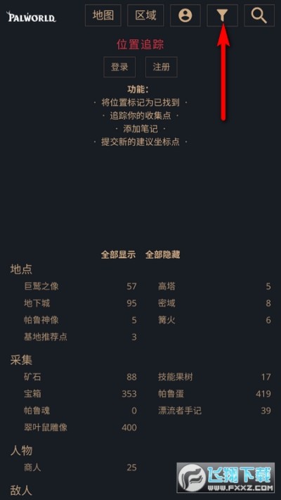 2.点击最上方的漏斗图标进行筛选,显示隐藏的地图或者地标;