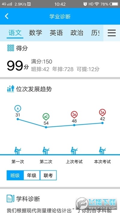 可以查看不同考试成绩变化的趋势,把班级、年级和联考的成绩信息。