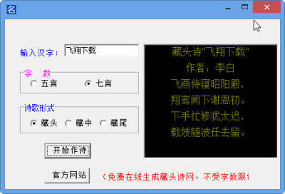 藏头诗在线制作(做诗机)是一款绿色免费的藏头诗制作工具。软件功能强大,可以帮助你创作藏头诗,支持藏头、藏中间、藏尾。同样的文字同样的设置,如果想生成其他诗句,可以再次点击;开始作诗;,每次都会出现不同的诗句。