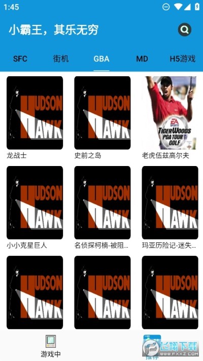 1.游戏一共分为五类,像FC、SFC、街机、GBA、MD、H5游戏统统都有。