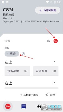 1、在本站下载cwm莱卡相机水印中文版后安装在手机上并打开,进入页面后在打开的设置模板中先确定logo是否是cwm莱卡相机水印中文版标识,模板一般默认就行,如果还要添加可以进行添加。对设备的品牌可以通过旁边的小眼睛进行显示与不显示