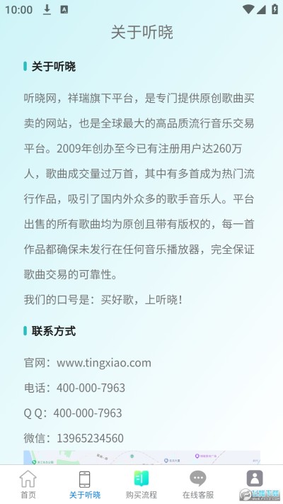 听晓网,祥瑞旗下平台,是专门提供原创歌曲买卖的网站,也是全球最大的高品质流行音乐交易平台。2009年创办至今已有注册用户达260万人,歌曲成交量过万首,其中有多首成为热门流行作品,吸引了国内外众多的歌手音乐人。平台出售的所有歌曲均为原创且带有版权的,每一首作品都确保未发行在任何音乐播放器,完全保证歌曲交易的可靠性。